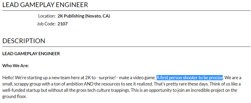 Como indicábamos antes, es posible que este nuevo equipo vaya a servir de soporte para el nuevo juego de Gearbox, o a otra franquicia de la cartera de 2K Games, aunque es todo especulación en el momento en el que las ofertas no aparecen relacionadas a ningún estudio, o franquicia concretos.