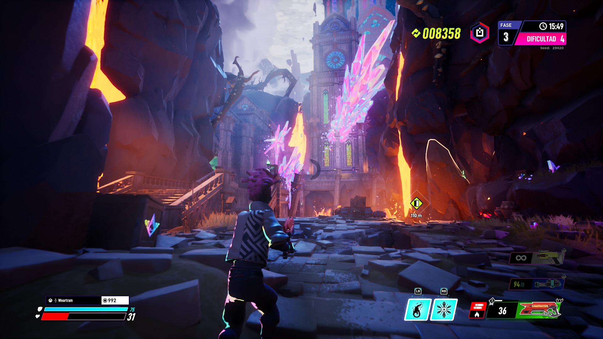 Una vez dentro de las partidas, deberemos de ir completando los desafíos propuestos para avanzar, estos serán siempre los mismos e irán variando entre ellos. Cada mapa se divide en dos partes con una sala para descansar, equiparnos con mejores armas -siempre que no hayamos encontrado equipo mejor explorando-, restablecer nuestra vida o, lo más interesante para mi gusto, aumentar la dificultad y no tener que esperar al siguiente nivel. Si la aumentamos, las recompensas por aniquilar a nuestros enemigos serán mayores, aunque también tendrá sus consecuencias como el recibir más daño.