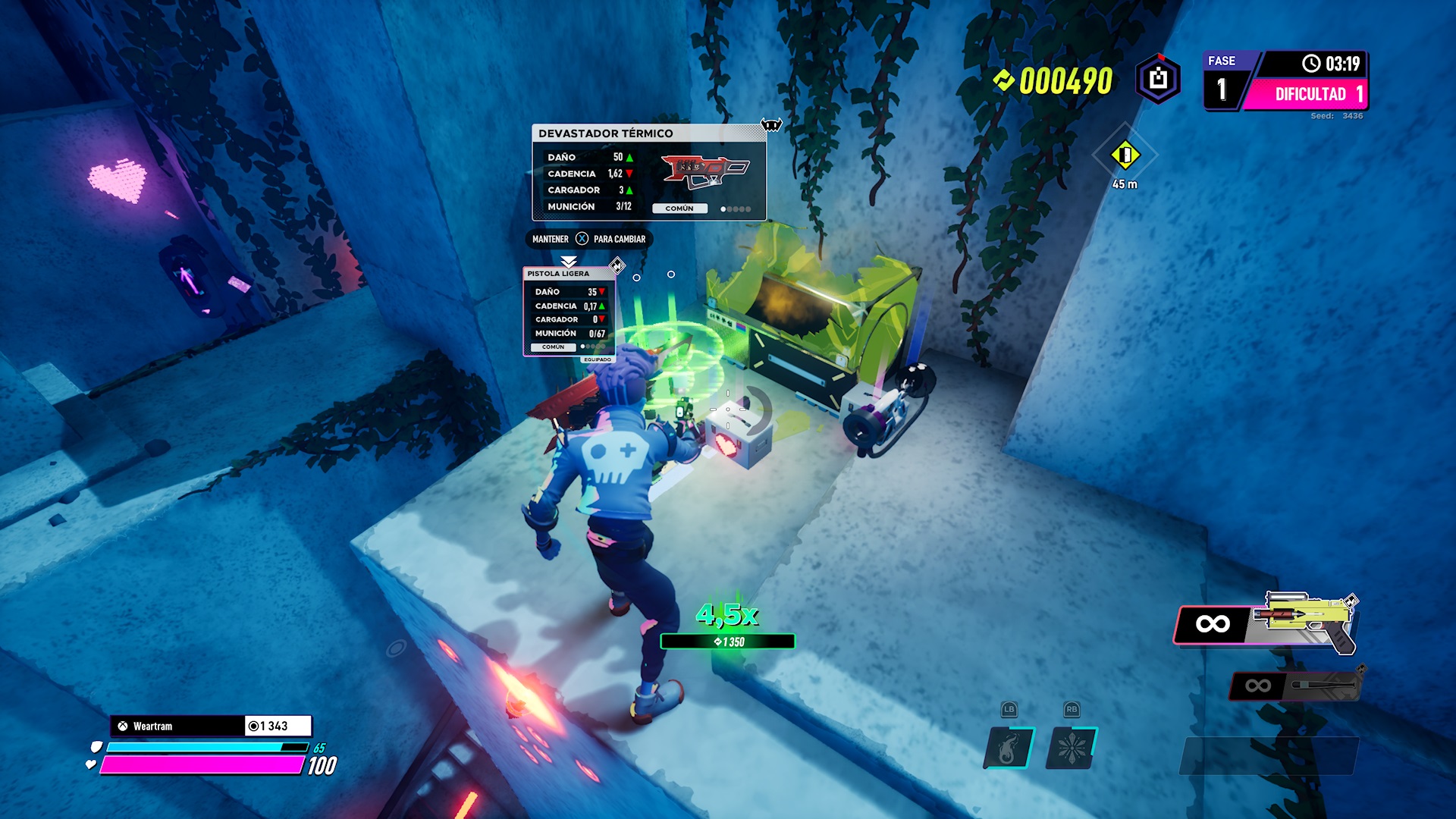 Su jugabilidad es muy simple. Una vez pasemos el tutorial, demasiado largo para mostrarnos dos mecánicas contadas, acabaremos en una base, que es la tienda de recreativas de Gilly. Dejando la historia a un lado, en dicho lugar podremos mejorar las dotes de nuestro personaje, ir desbloqueando nuevas armas para comenzar la partida directamente con ellas, aceptar misiones de otros NPCs que se encuentran en la tienda y similares. Me sorprendió ver que el juego tiene una cantidad absurda de cosméticos y muy poco desarrollada las habilidades y aptitudes de nuestro personaje. Teniendo en cuenta que se trata de un roguelite nos sabrá a poco la progresión existente, y muy satisfactoria la personalización. También decir que en la misma sala tendremos varios minijuegos, como un modo PvP, pero este es secundario.