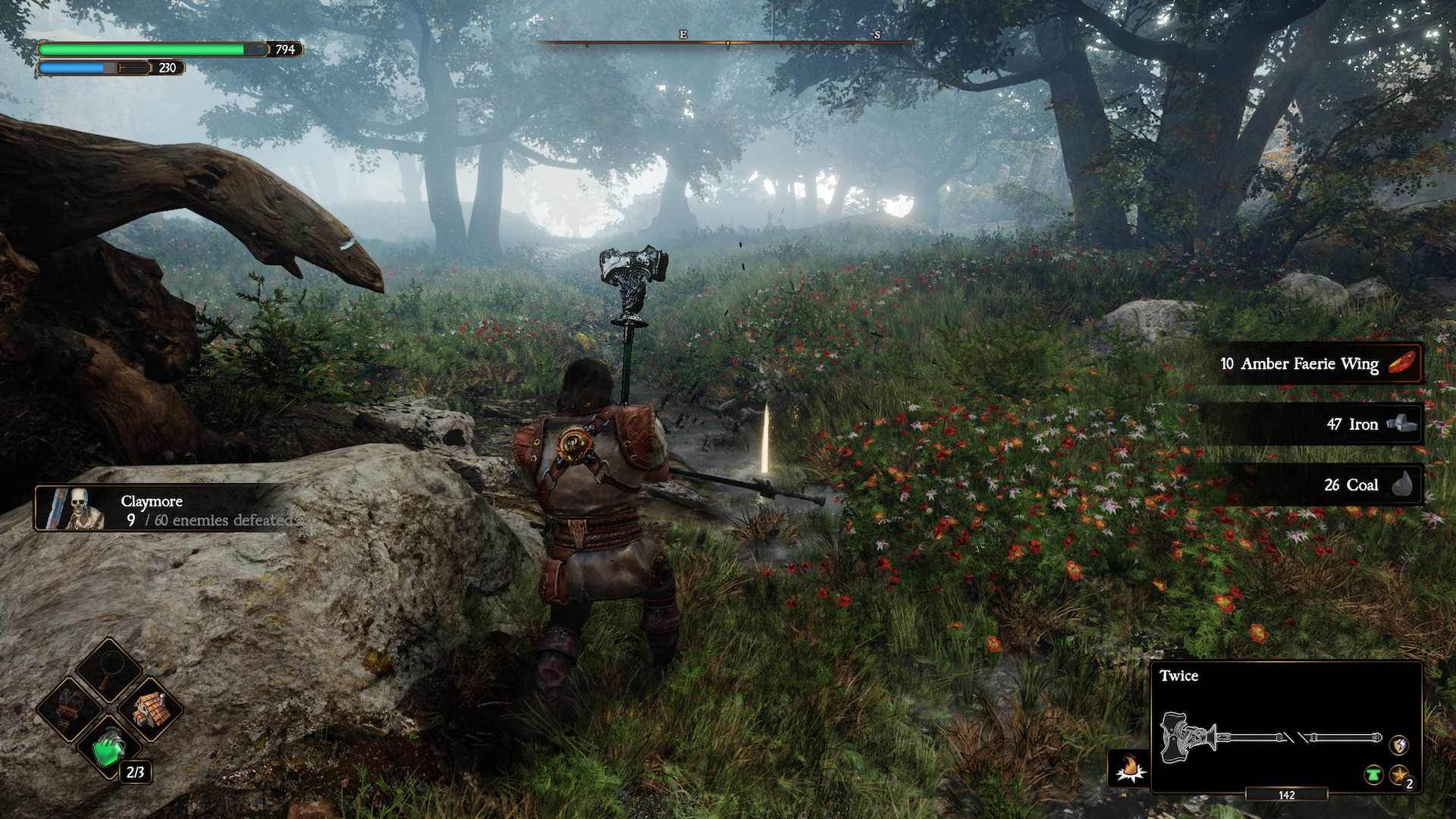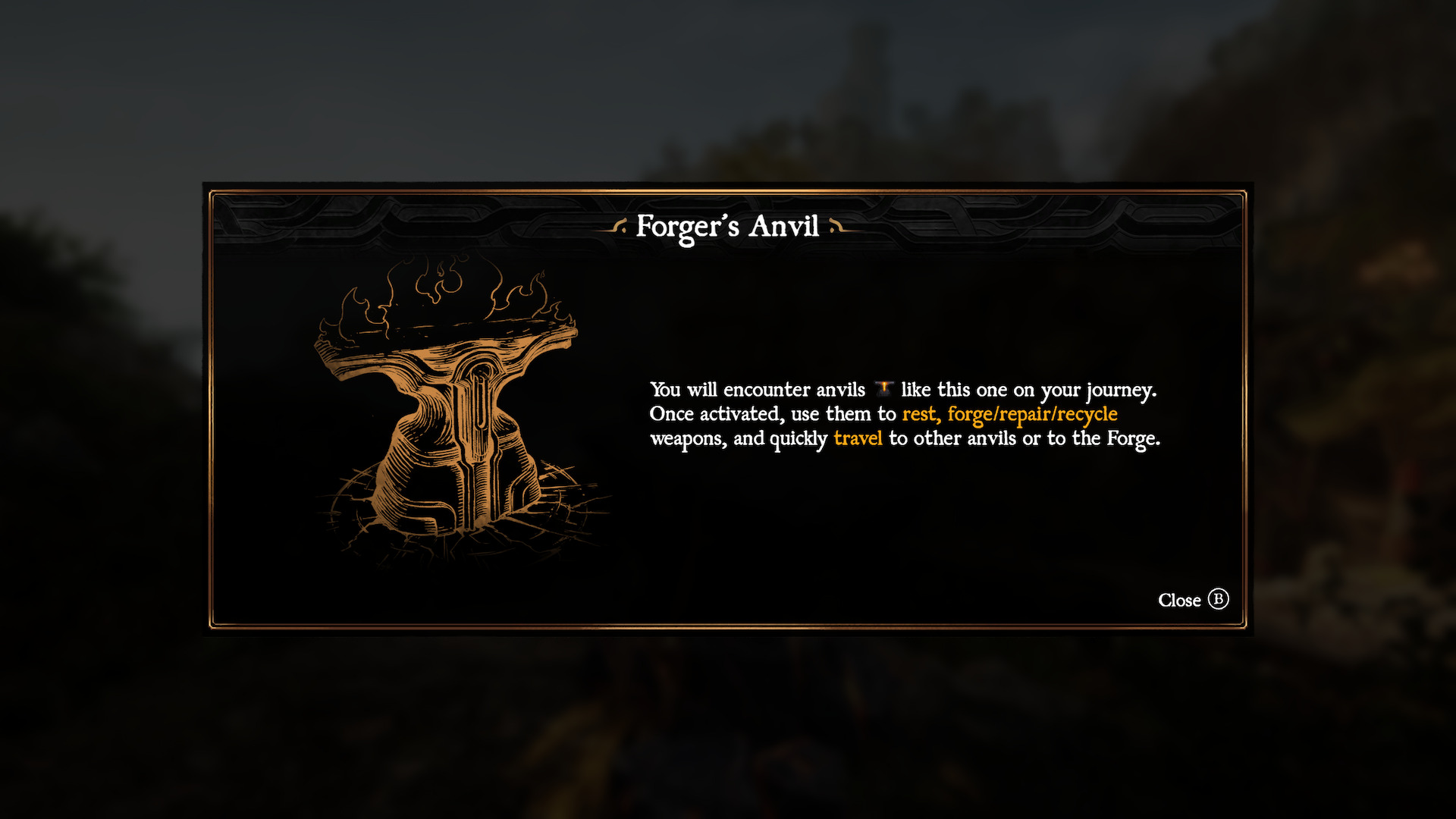 Si morimos, perderemos nuestra arma y deberemos de regresar a ese punto a recuperarla. Además, tendremos unos yunques, que serviran de hoguera, para reciclar, forjar o descansar, esto último al hacerlo, reiniciará a los enemigos del lugar, volviendo a aparecer, ya sabes como los soulslike