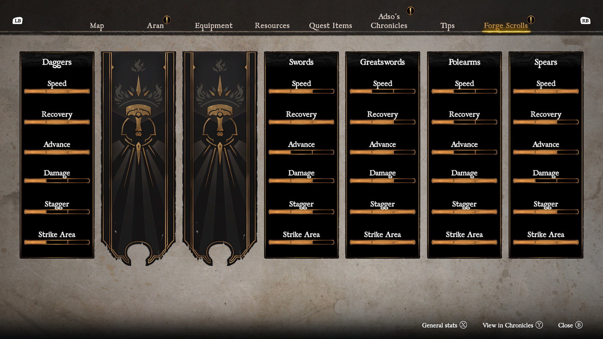 Hasta aquí, ya sabes que la forja es fundamental para tu personaje, no hay subidas de nivel o armaduras especiales, todo se basa en tus armas que serán tus posibilidades frente a los enemigos. Aunque, también existen una especie de pergaminos que suben ligeramente ciertas estadísticas de vida, o de estamina.