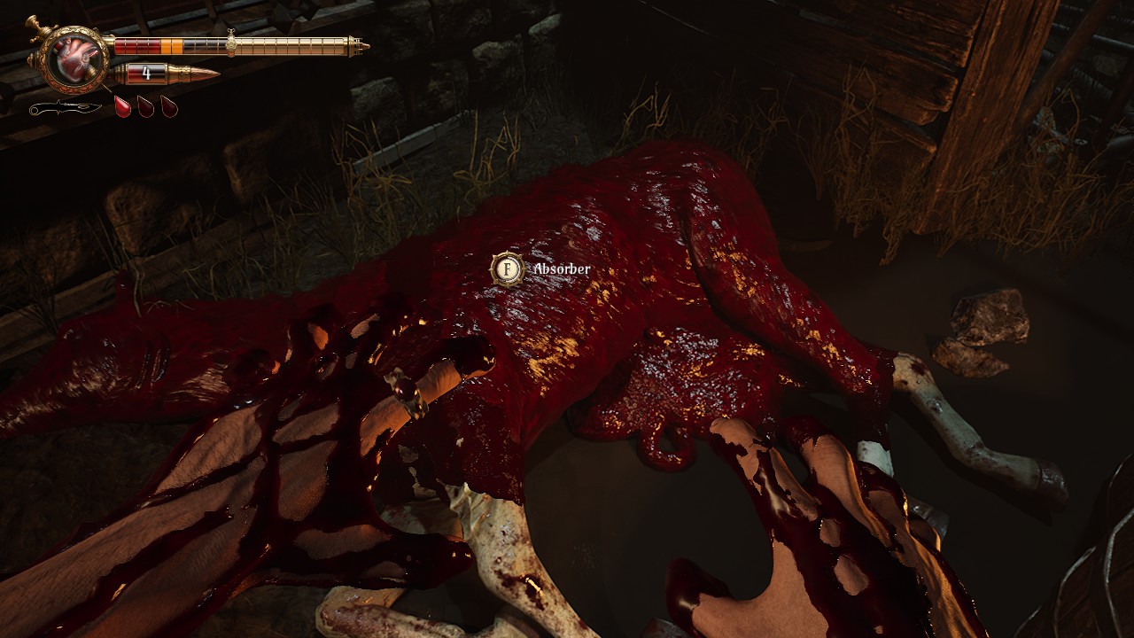 Esta constante pérdida de sangre abre la puerta a otras formas de obtenerla, por ejemplo, absorberla de cadáveres de animales que abundan por las calles de Tormentosa e incluso, si se quiere, de algunos humanos que yacen muertos, lo cual también añade los recuerdos del fallecido que pueden permitir resolver algunos puzles. La sangre permite también cambiar algunos objetos, como las propias armas, creando así unas animaciones excelentes al momento de recargar.