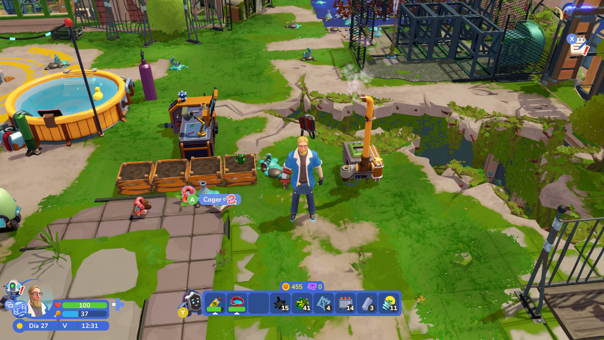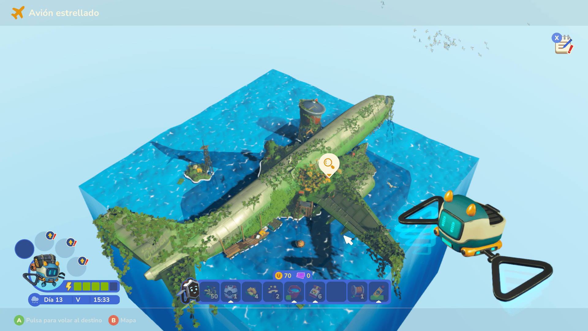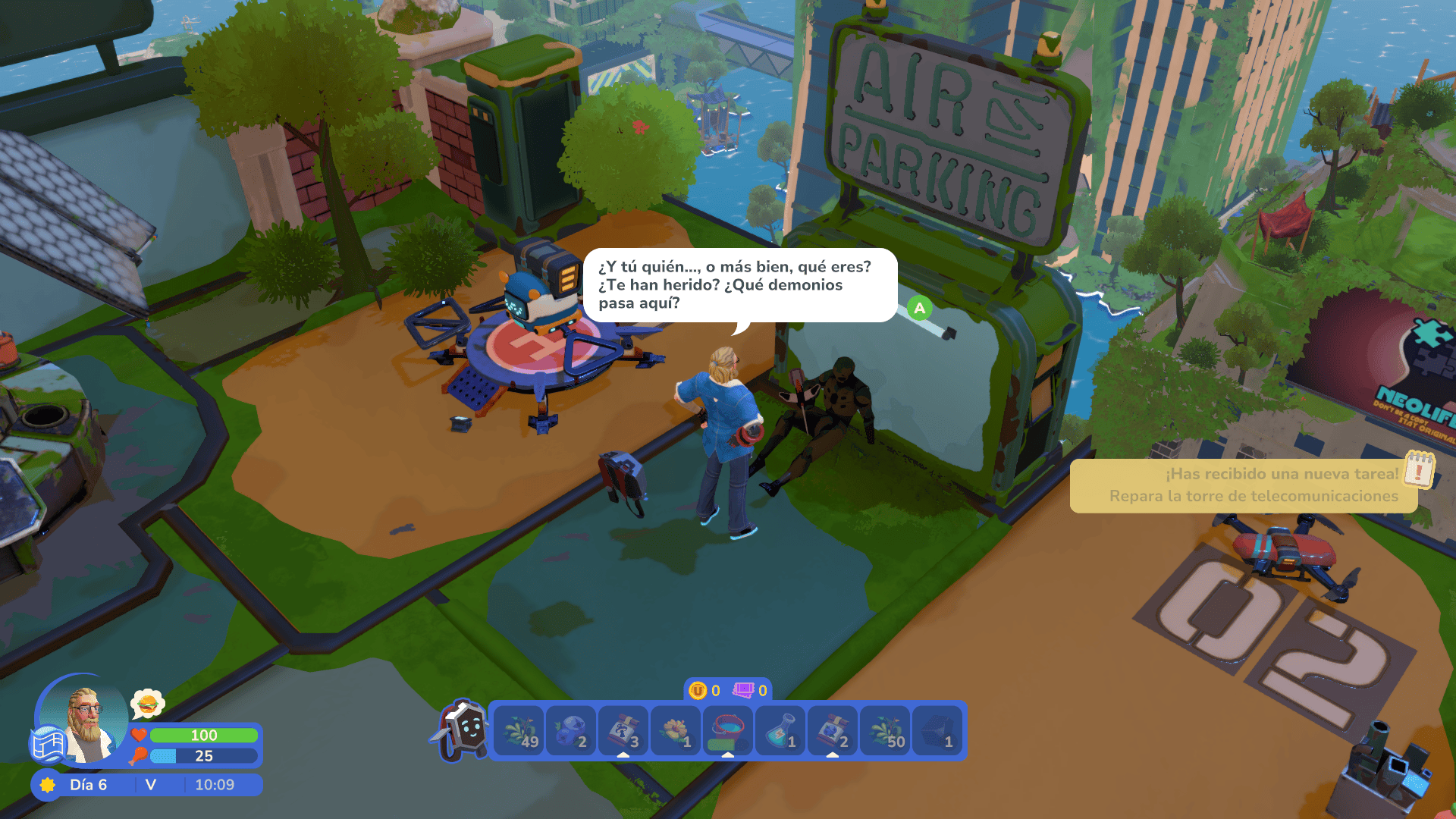 Cuando ya se hayan establecido las partes más básicas de lo que sería la base en el techo, el juego se abre a otra de sus mecánicas principales: la automatización. Esto se logra a través de robots que pueden programarse para realizar tareas como recolectar cosechas, regar o incluso explorar lugares de las cercanías con drones para recolectar material o incluso comerciar con otros puntos distantes.