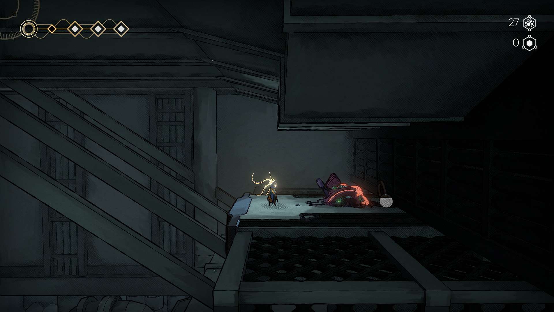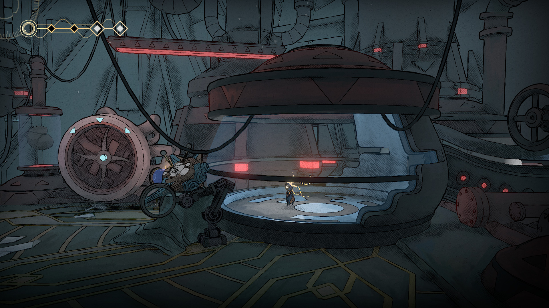 Visualmente el juego impacta desde las primeras escenas con un diseño en 2D pintado con acuarelas que le sienta verdaderamente bien. Lo cierto es que se hace necesario destacar el trabajo de los diseñadores que lograron darle color a una nave espacial con una opción creativa colocando distintos microclimas o biomas dependiendo la sección de la estructura en la que se encuentra la protagonista. Las partes superiores de La Nave están en mejores condiciones, pero a medida que se desciende comienzan a aparecer estructuras rotas, formaciones de hilo, flora descontrolada y mucho más lo que se traduce en una imponente paleta de colores verdaderamente hermosa.
