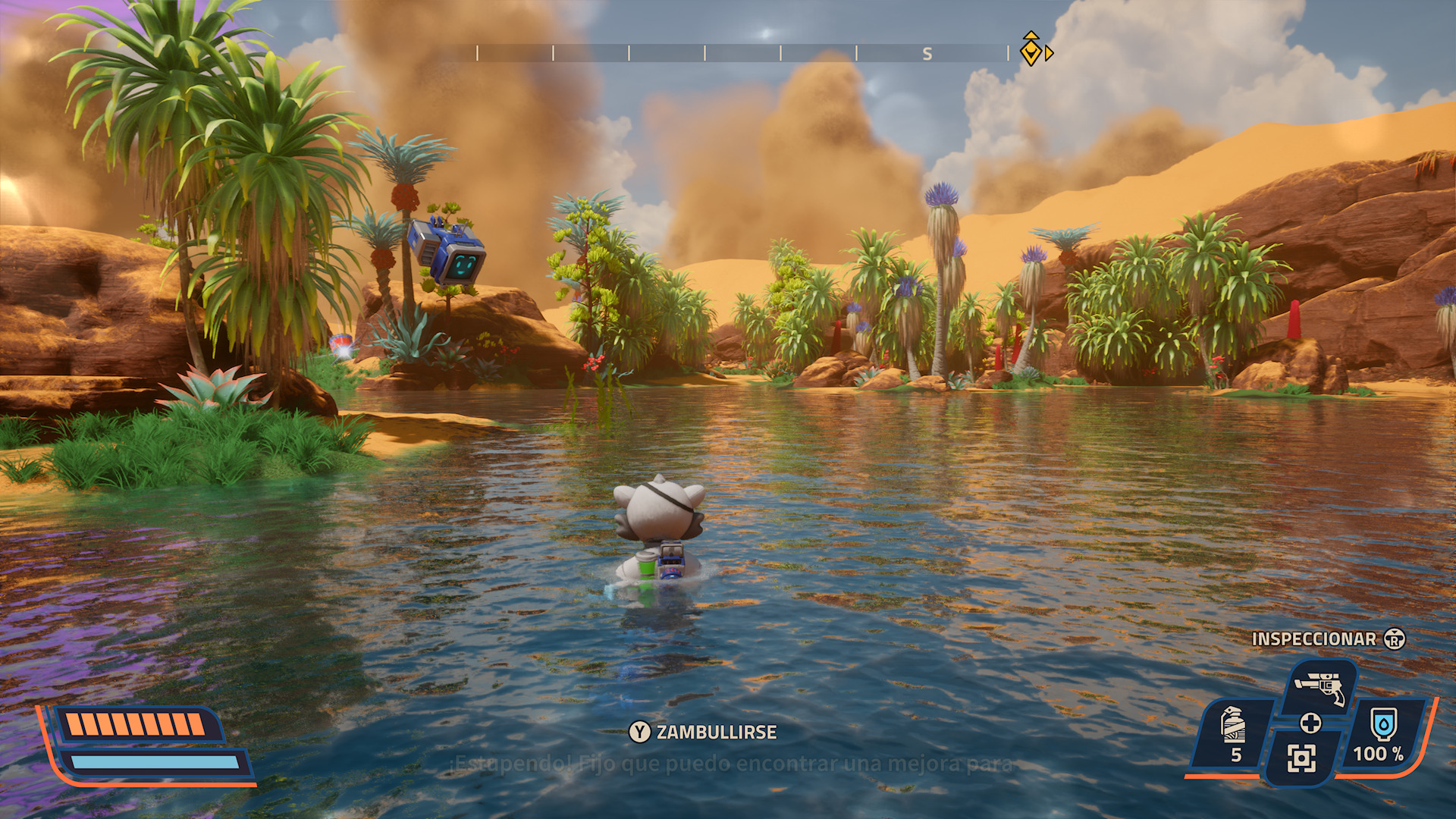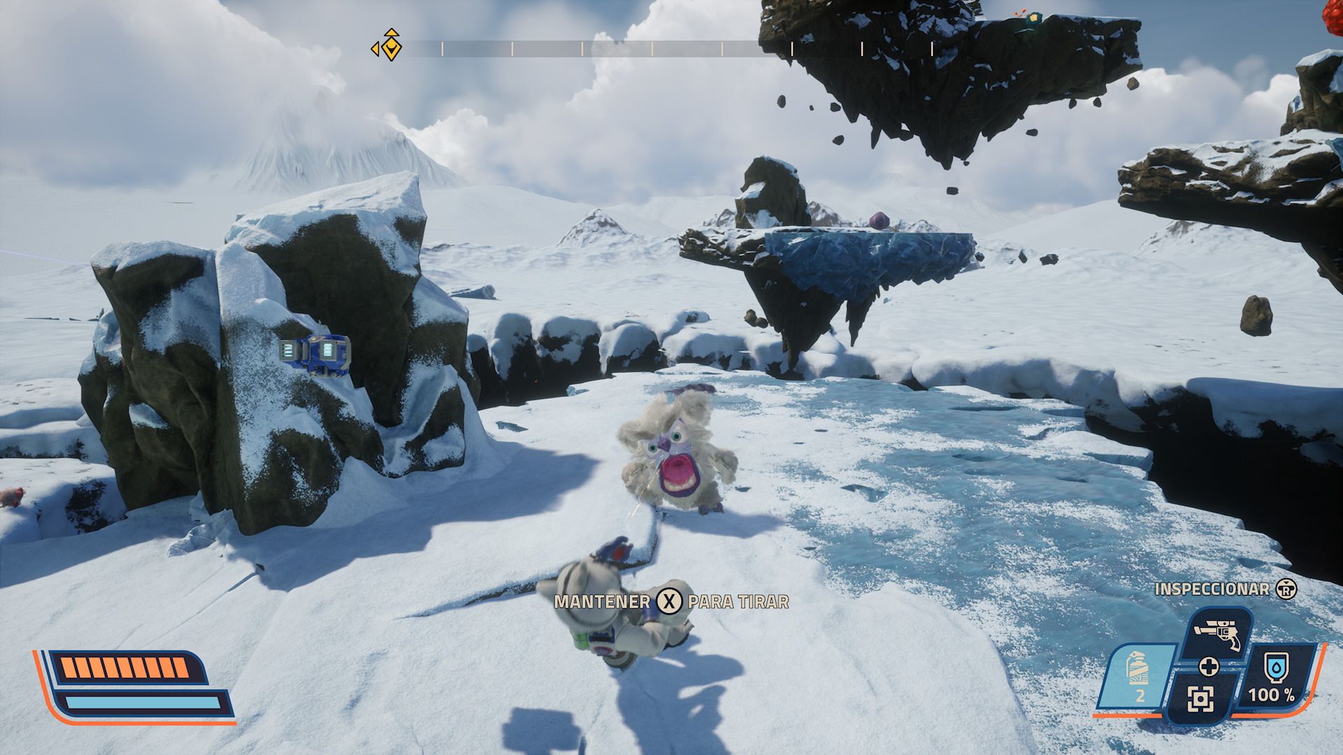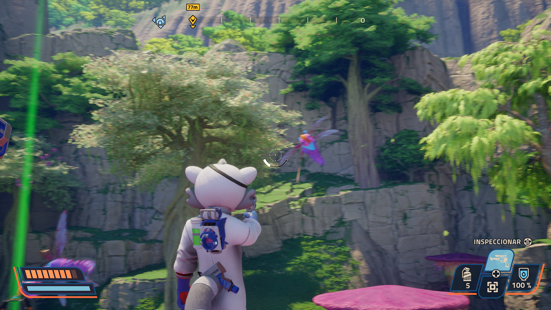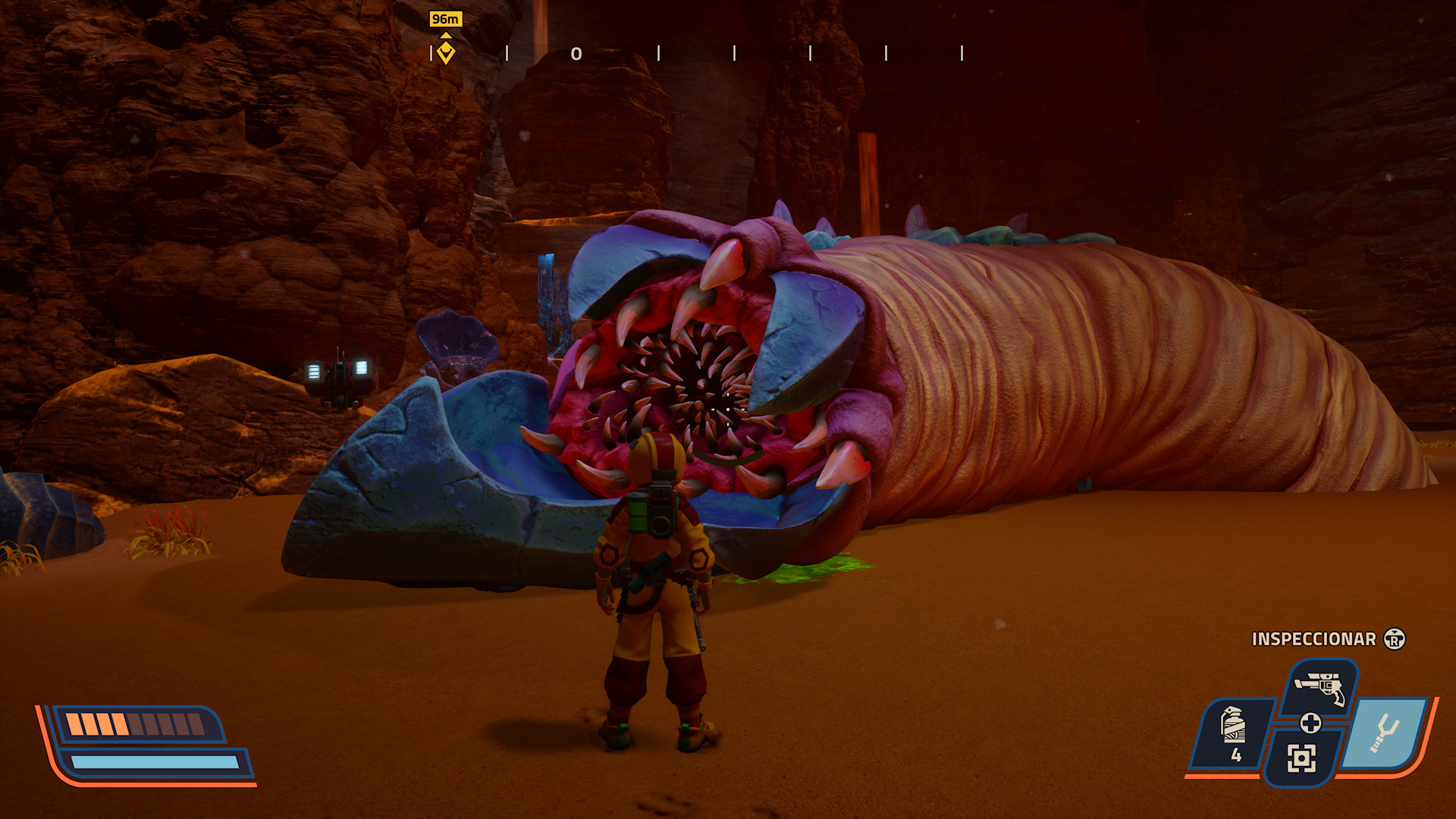 La jugabilidad incluye los clásicos movimientos de saltar, correr y disparar con un bláster, al menos al inicio. Algo que me ha encantado es la clara inspiración en la saga Metroid, ya que podremos escanear prácticamente todo: objetos, criaturas y elementos del entorno. Esto convierte la experiencia en una carrera por alcanzar el 100% de exploración, algo que inevitablemente recuerda a las aventuras de Samus Aran.