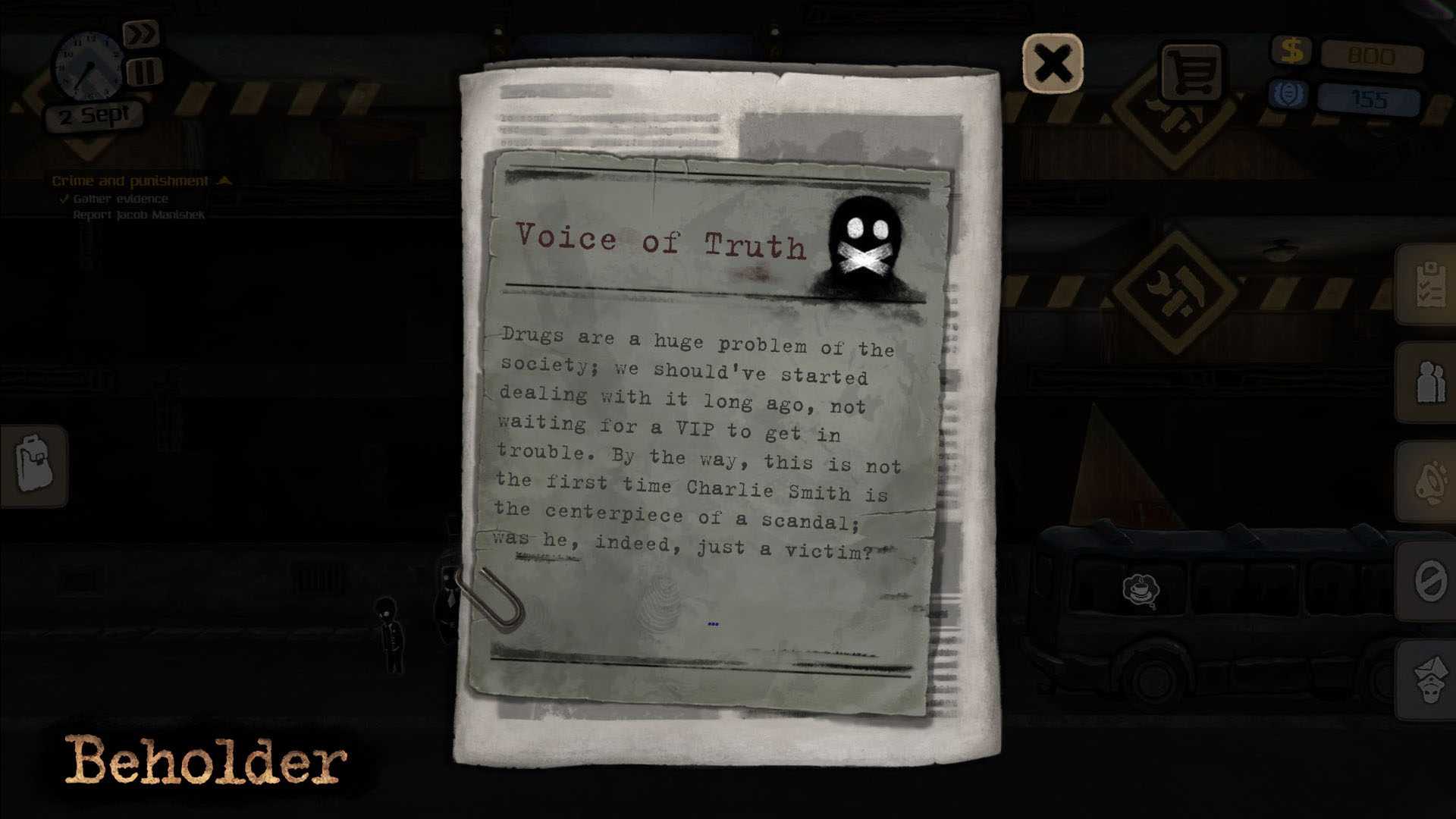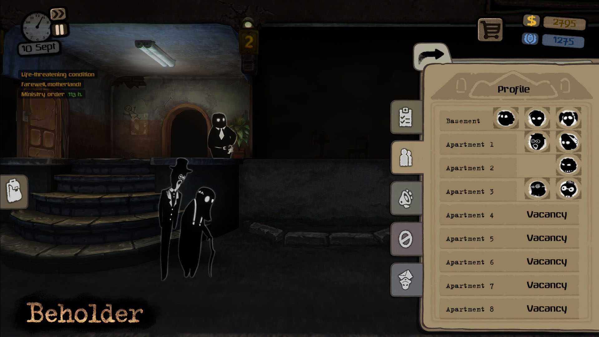 En Beholder, nos encontramos que El Estado exige que nuestro protagonista Carl sea el encargado para monitorear a sus ciudadanos leales y asegurarse de que la disidencia siga siendo una palabra en el diccionario como era de esperar la vocación del terrateniente, se vio obligado a eliminar todos los rastros de infección rebelde para proteger al país de las garras del mal de la insurrección.