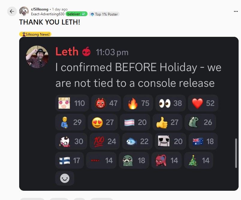 La desarrolladora del juego, Team Cherry, ha estado trabajando en Silksong durante varios años, y aunque no se ha proporcionado una fecha de lanzamiento exacta, la confirmación de que el juego estará disponible antes de la temporada de vacaciones es un alivio para muchos. Esto lo comentan en Reddit con un colaborador del juego.