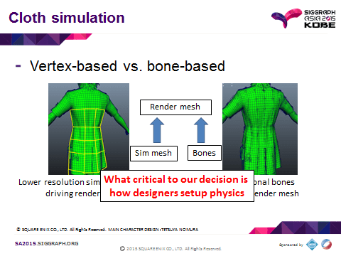 Para el pelo y la ropa normalmente suelen utilizar técnicas de vértices, cosa que no se les da mal si las texturas que tienen que aparentar son de origen suave, pero la cosa cambia cuando las texturas deben de ser algo más rígidas, como el cuero, donde han llegado a la conclusión de deben utilizar la base tradicional Bone.