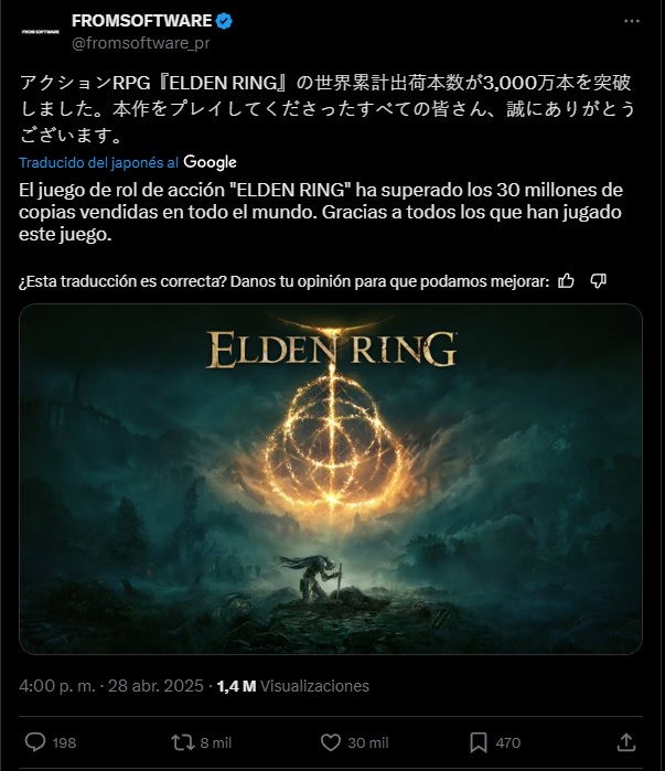 La gente no solo se está preparando para Elden Ring Nightreign, ya que también es debido que su expansión se lanzó el año pasado, que el título lanzado en 2022 sigue sumando grandes cantidades de ventas a día de hoy, superando ya las treinta millones de copias, algo que ha confirmado y celebrado From Software en redes sociales.