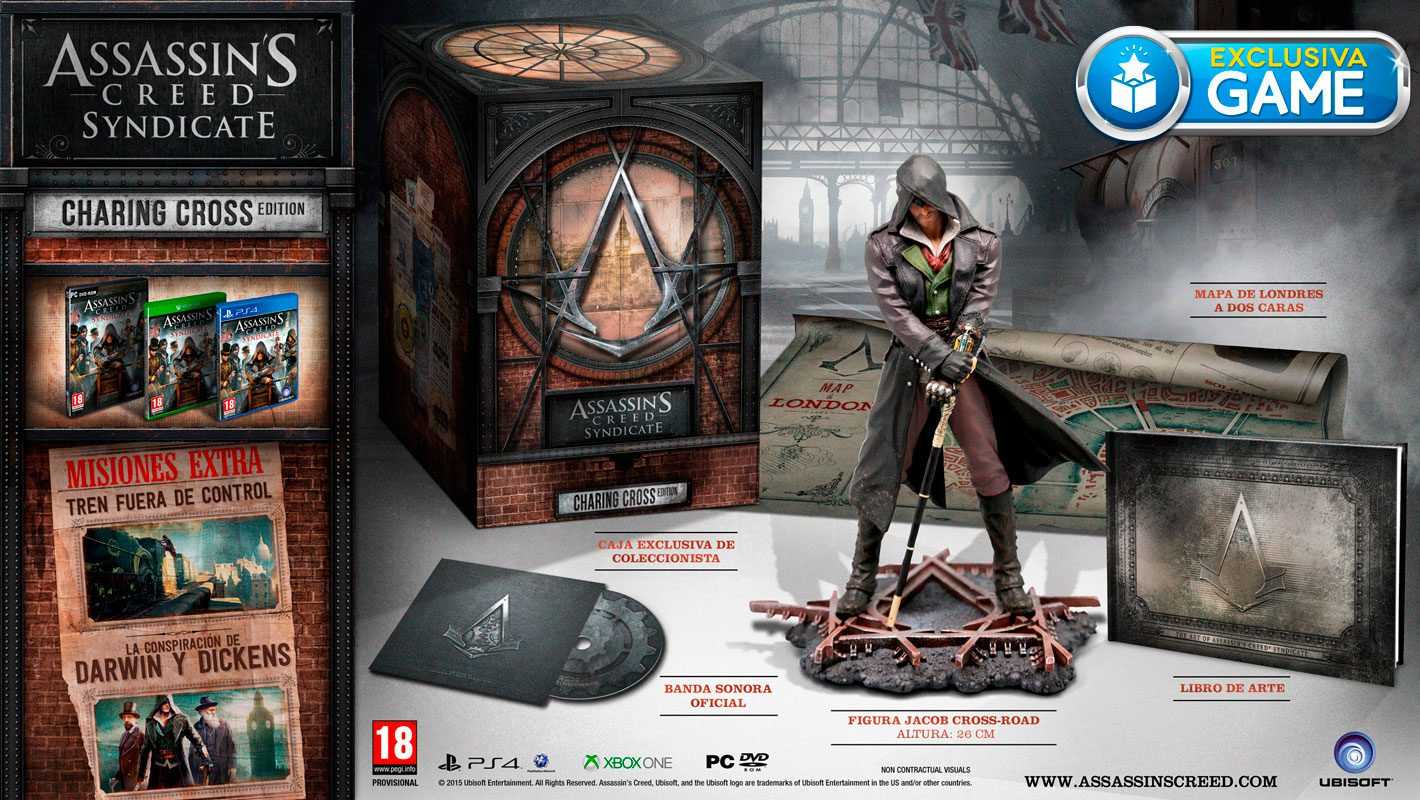 • Assassin’s Creed Syndicate Charing Cross Edition, solo en GAME, que incluye el videojuego, las misiones “La Conspiración de Darwin y Dickens” y “Tren Fuera de Control” que amplían la duración del juego en más de 1 hora, un libro de arte, un mapa de Londres a doble cara, BSO en formato físico y además una figura de 26cms de altura del cruce de vías de Jacob, y todo ello en una caja exclusiva de coleccionista.