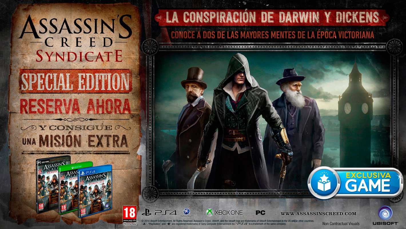 • Assassin’s Creed Syndicate Special Edition, solo en GAME, que incluye: videojuego y la misión “La Conspiración de Darwin y Dickens” que aumenta la duración del título en casi 1 hora, por el mismo precio que la edición básica.
