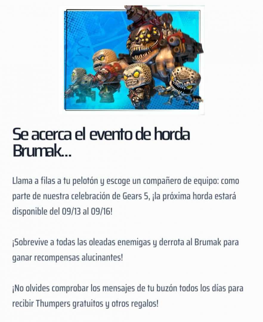 Muy interesantes ¿Verdad? Pero eso no es todo, también podremos disfrutar de un nuevo evento de horda, aunque para este tendremos que esperar al día 13 de septiembre. Este evento nos anima a combatir en una horda donde el temido Brumak será el enemigo a batir. Tendremos thumpers gratuitos cada día que dure el evento y parece que habrá muchos premios, así que aprovechad los días que dura para conseguir mejorar vuestras chapas en Gears POP!