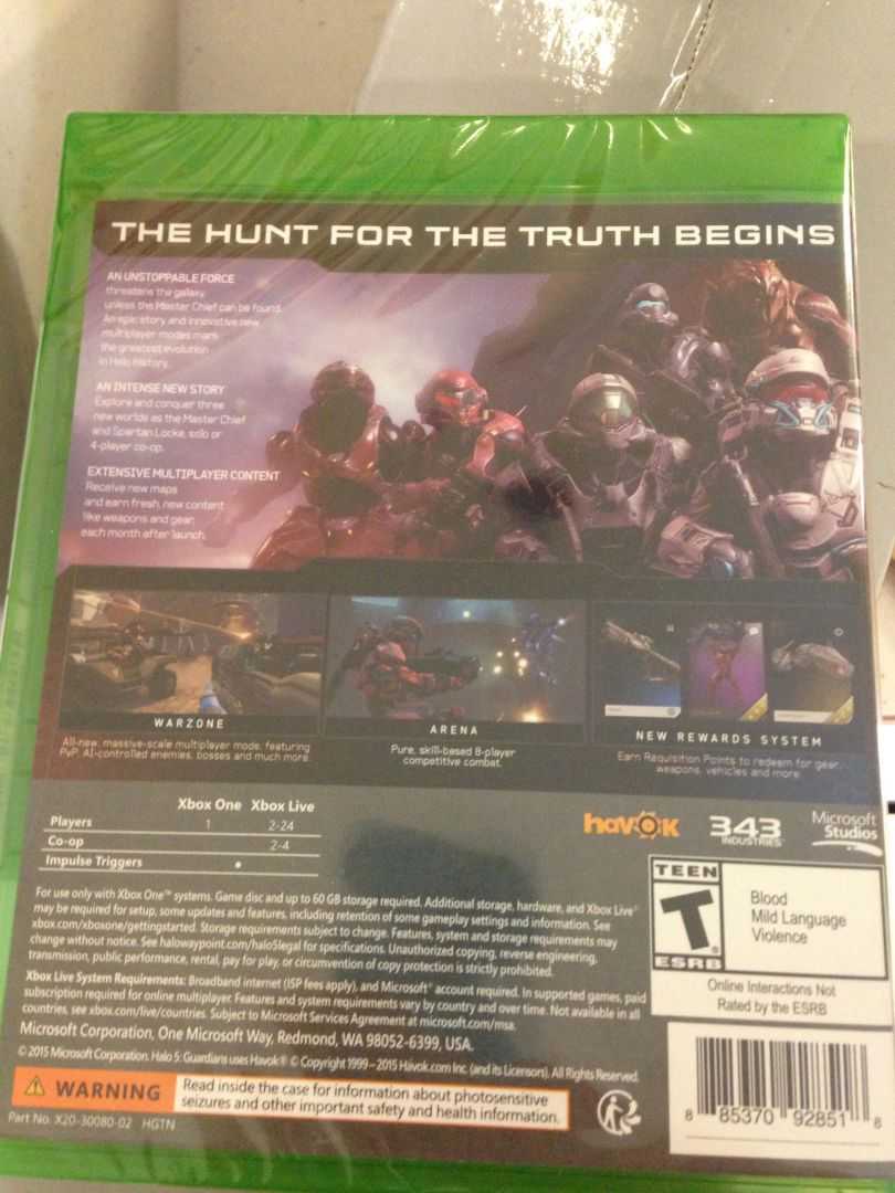 Pues como hemos dicho ya en varias ocasiones, guardad espacio libre en vuestro disco duro, al menos 60 Gb, que parece ser que será lo que ocupará Halo 5: Guardians en nuestras Xbox One. En esta ocasión, nos hemos enterado debido a unas fotos bastante reveladoras de la caja final del juego precintada, en la que por detrás aparece esta recomendación de espacio. A pesar de que la descarga actual en la página de Xbox.com es de 46,19 Gb, probablemente necesitemos un poco más.