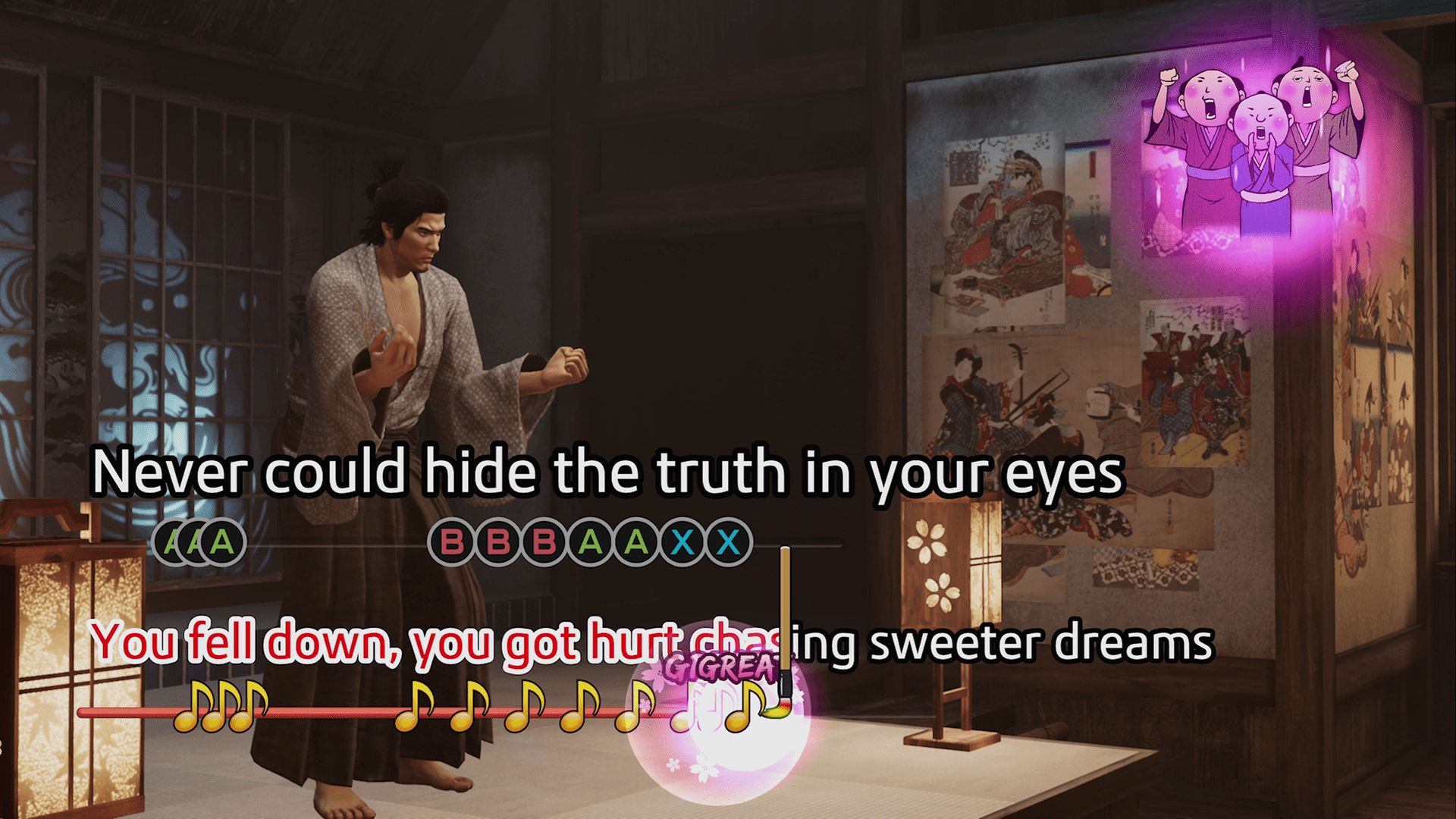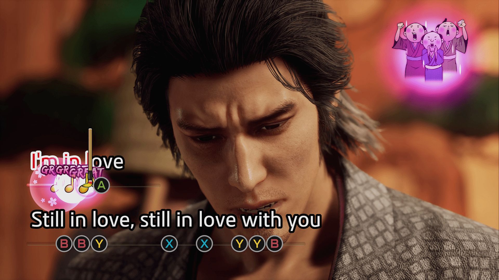 Hemos probado el Karaoke, tan característico de la saga, con el sistema de seguimiento de letras utilizando distintos botones del mando (personalmente, nunca falla, así que sigue siendo nuestro minijuego favorito). También hemos podido probar el minijuego de baile, el Buyo, un baile típico japonés, tras una hilarante misión secundaria y que, lejos de ser lo que aparenta, ha sido bastante complicado sacar puntuaciones suficientemente buenas para satisfacer las expectativas de la casa de baile, sin duda, uno de los minijuegos más divertidos.