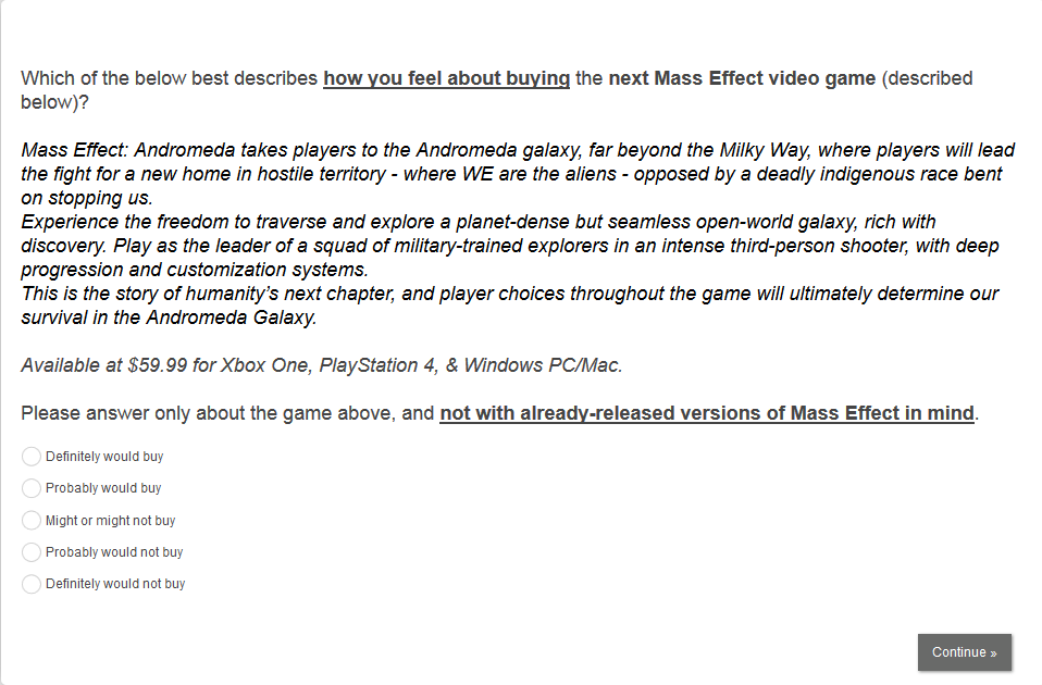 La primera pregunta es una descripción del juego, a lo que los usuarios deberán responder si estarían dispuestos a comprar el juego o las posibilidades de compra en función de la descripción y un precio de 60 dólares; la descripción es la siguiente: