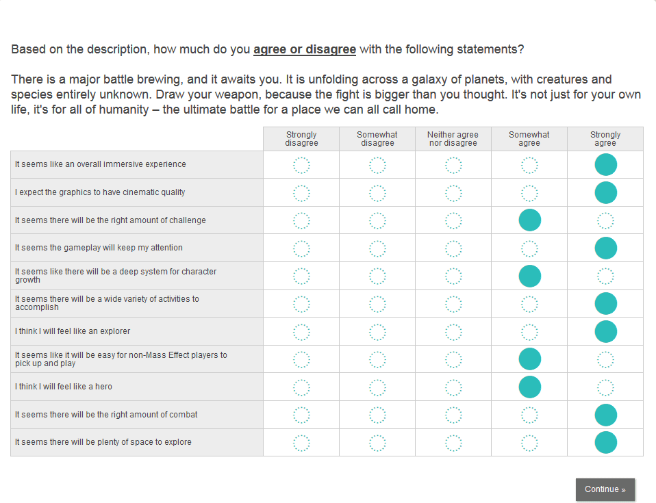 Pero por si esto no fuera poco, hubo una segunda parte de la encuesta, donde preguntan a los usuarios si les gustaría ver escenas cargadas de gameplay, o mucho combate, muchas zonas de exploración, una galaxia extensa, el uso de las cinemáticas, y los usuarios debían responder en una escala tipo likert con 5 opciones de respuesta desde «Muy en desacuerdo» a «Muy de acuerdo«.