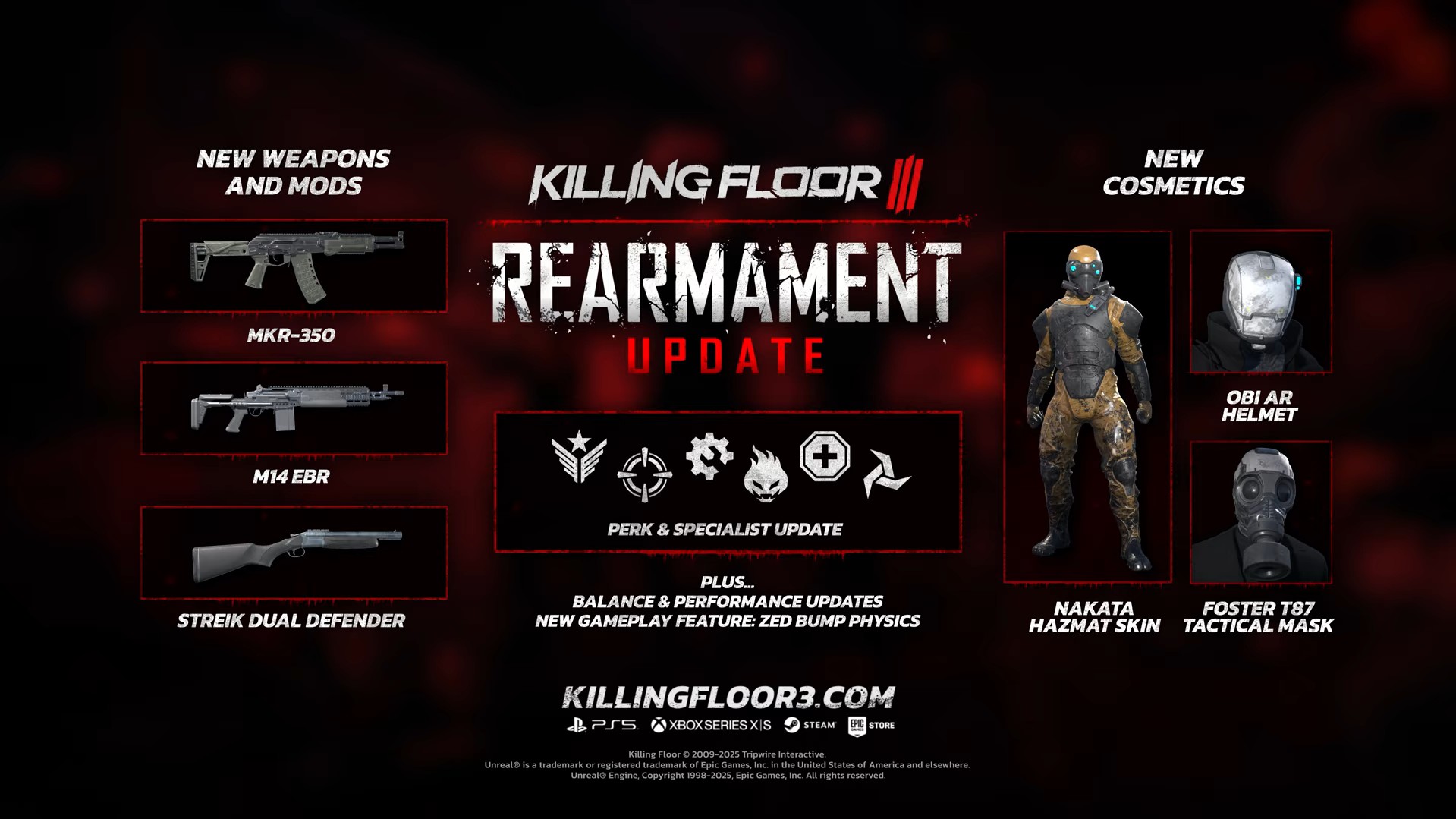 Es casi seguro que los desarrolladores pretenden añadir muchas cosas a Killing Floor 3 y ya tenemos disponible su última gran actualización de nombre «Rearmament» que añade tres nuevas armas, mejoras en los perks de los personajes, nuevos cosmeticos y varias mejoras y ajustes al rendimiento del juego.