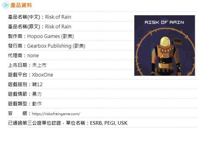 Aunque ya ha habido algún movimiento en el sistema USK de clasificación alemana donde ya aparecía hace unos días Risk of Rain 2 para consolas, Taiwan da un paso más allá porque no sólo clasifica la primera parte, si no también la segunda, como podéis ver en estas capturas de la propia web: