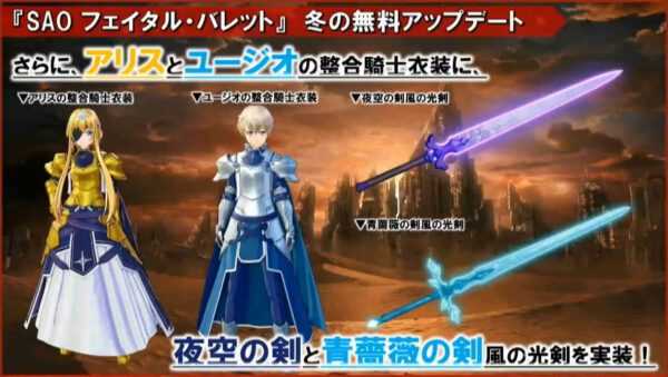 Con esta actualización también se añaden nuevo equipamiento y disfraces al juego, como la posibilidad de convertir a nuestro avatar en Rony Arable o Tiese Schtrinen de Sword Art Online: Alicization Lycoris; así como los nuevos trajes de Alice y Eugeo Integrity Knight y las nuevas armas Night Sky Sword, Blue Rose Sword, Royal Guard Gold y GL6 Disaster Gold.