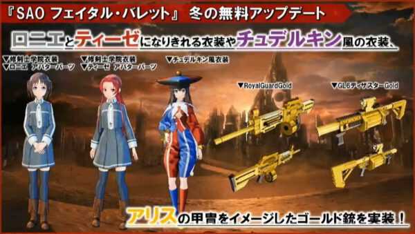 La actualización de invierno de Sword Art Online: Fatal Bullet añadirá nuevo contenido al título de manera gratuita, entre el que se incluye una nueva misión en la que tendremos que descubrir que le está sucediendo a nuestra preciada ArFA-sys así como una gran cantidad de equipamiento nuevo.